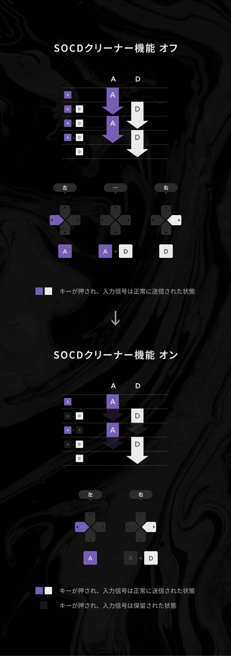 SOCDクリーナー機能は、左右など反対方向キーの同時入力時に動作の優先ルールを4パターンから選択できる機能です。とくに「最後に押したキーを優先」する設定では、キーを離さずとも瞬時に方向転換が可能に。キャラの動きを止めず、高速な左右移動を実現します。